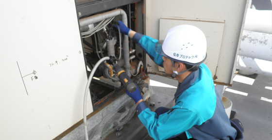 - 吸収式冷凍機・設備修理更新時などに排出される洗浄廃液、吸収液(六価クロム含有臭化リチウム)・ブラインや冷凍機油など、当社の技術者が確実に抜き取り回収を行います。